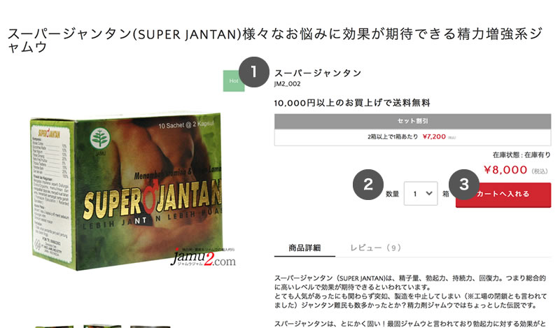 | ① ご注文する商品名をご確認ください。 ② 数量を選んでください。 ③ カートへ入れるボタンをクリックしてください。 |